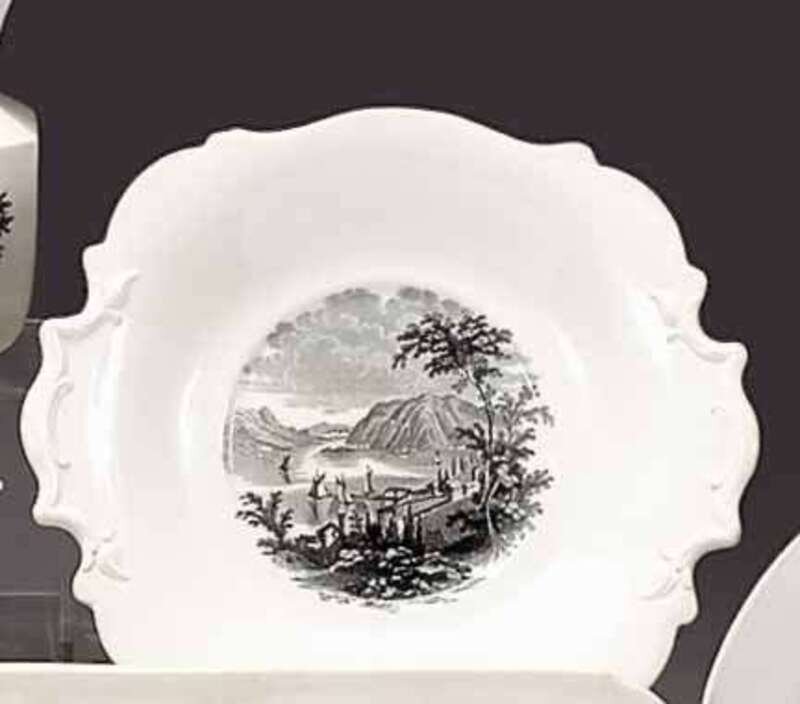 The shaped dish with molded handles decorated with "View from Ruggles House Newburgh Hudson River." .