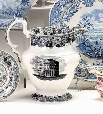 Historical black transferware pitcher andrew stevenson, cobridge, 1808-1829