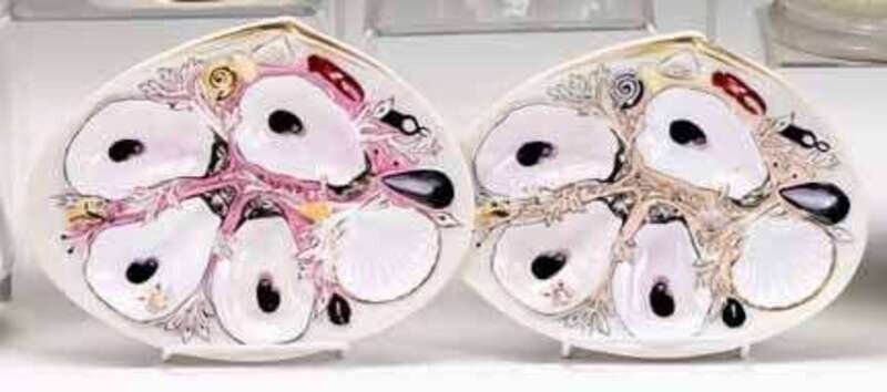 Pair of oyster plates with polychrome and gilt decoration union porcelain works, greenpoint, new york