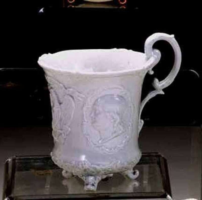 With a "c" scroll handle on shaped rim and tapering body, molded with profile portraits of Washington and Franklin within scrolled reserves and Great Seal of the United States, on three scrolled feet.