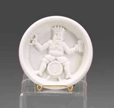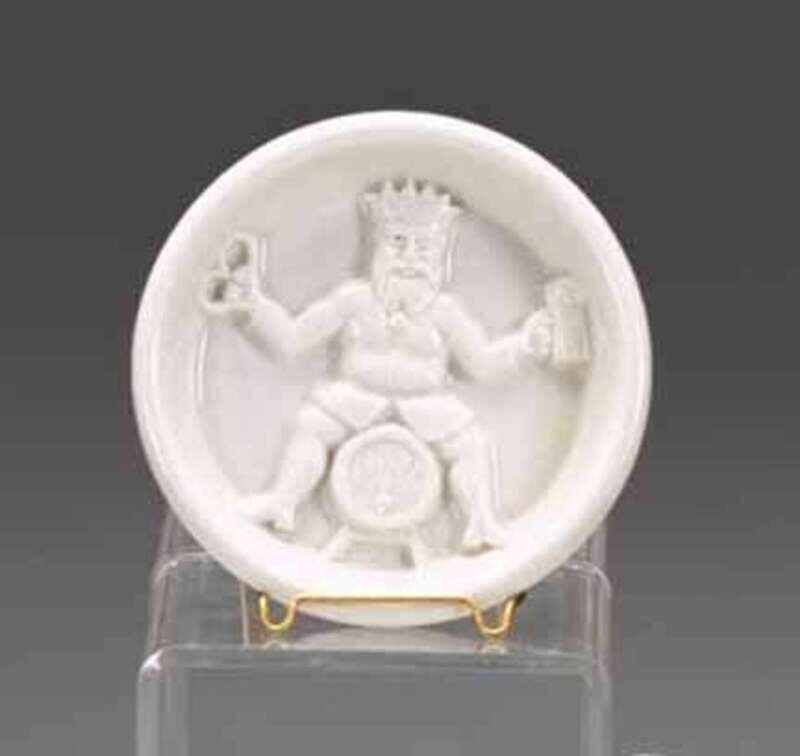Circular form deeply molded with king holding stein of beer and pretzel astride a keg, bearing the initials "U.P.W."