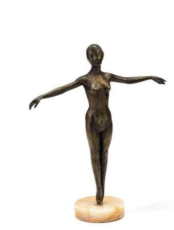 Bronze, medium bronze and gold patina, the standing figure with her arms outstretched, stamped L. Derbre and numbered 1/5, raised on an circular onyx base.