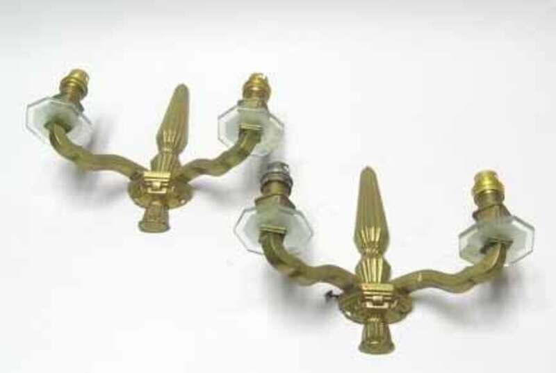 The shaped and fluted back plates with twin lateral scrolling candlearms with octagonal part-frosted glass bobeches.