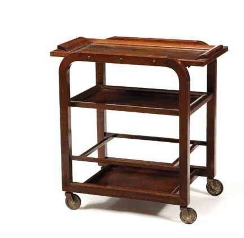 Second quarter 20th century, oak and glass, with a removable serving tray and casters, branded signatures.