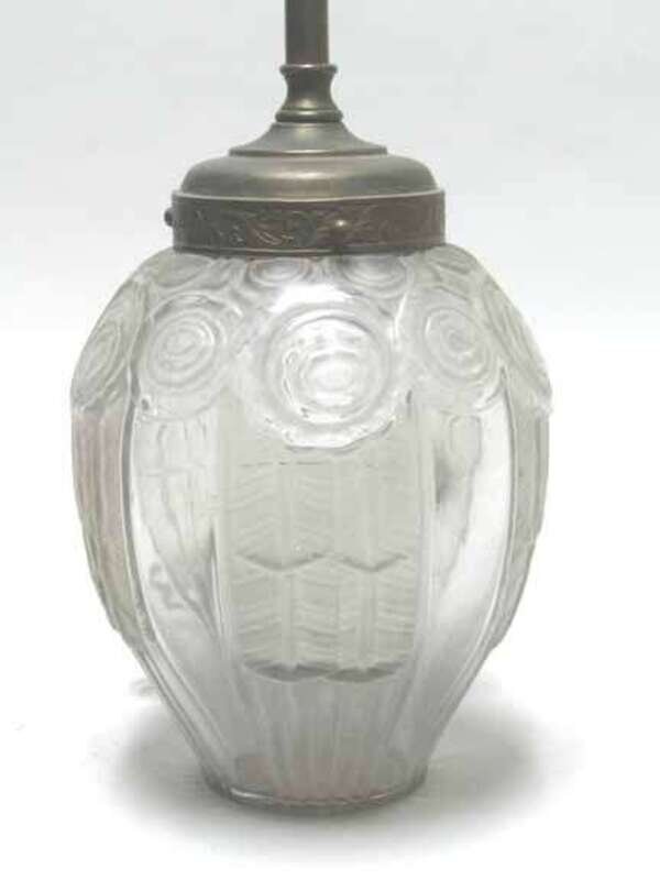 1920s, now mounted as a lamp, the sides with stylized geometric decoration, molded signature.