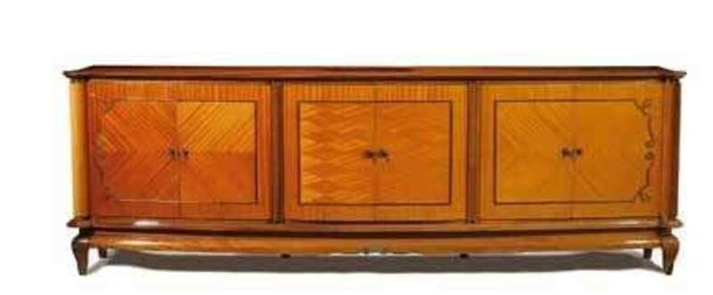 The shaped top over two central cupboard doors flanked by pairs of further cupboard doors, raised on scroll feet, with Gaston Tricoire, Marseille label.