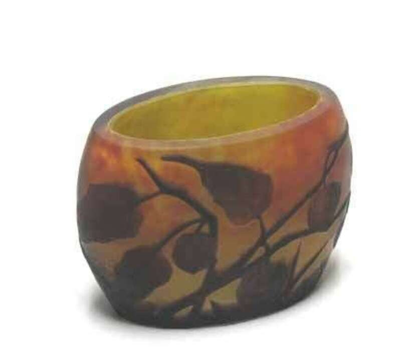 Early 20th century, mottled yellow glass, the sides with brown foliate overlay, signed in cameo Daum Nancy with Cross of Lorraine and etched Daum Nancy with Cross of Lorraine to underside.