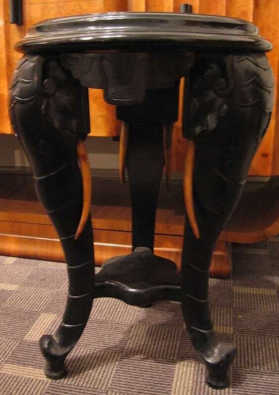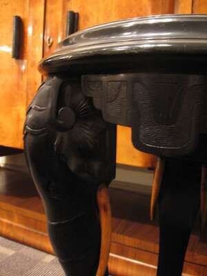 The molded circular top with a carved frieze raised on three downswept legs headed by elephant masks, united by a shaped undertier.