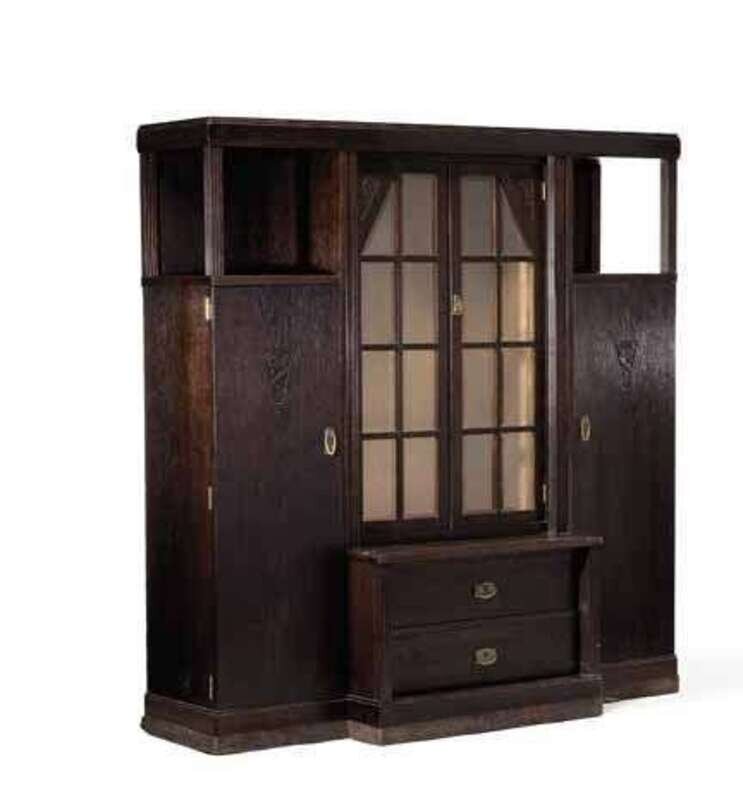 Circa 1910, oak and hammered copper, comprising a desk, side table, armchair and bookcase, the desk and bookshelf with carved geometric and bird motifs, the desk with an inset leather writing surface over three frieze drawers and two cupboards flanking the kneehole, with a fall front cupboard to the otherside and a corner bookshelf, the side table with a single frieze drawer, the bookshelf with two central astragal glazed doors enclosing a shelved interior over two drawers flanked by cupboards and upper corner shelves.
