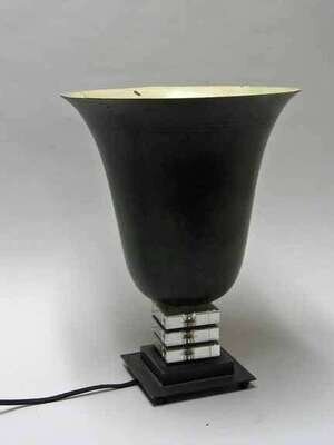 The flared sides and rim raised on a stacked glass support and a further plinth base, electrified.