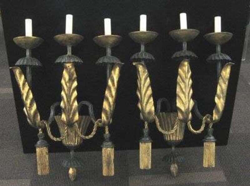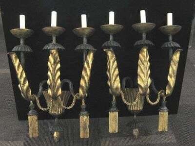 After a model by Gilbert Poillerat, the flared fluted urn form backing plates issueing three leaf cast candlearms united by swags.