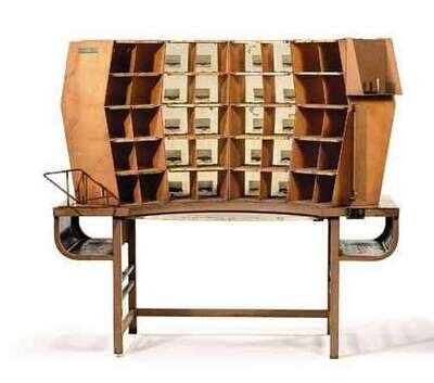 Mid 20th century for the Postes et Telecommunications, Valreas France 84600, enameled metal and plastic, with original name tags, the demilune structure with forty slots, manufacturer's labels.