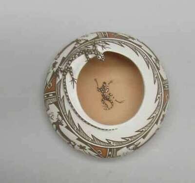 The sides with red and brown figural decoration, molded in relief with a lizard to the rim and a lizard inside on the bottom of the vase, signed and dated 8/85.