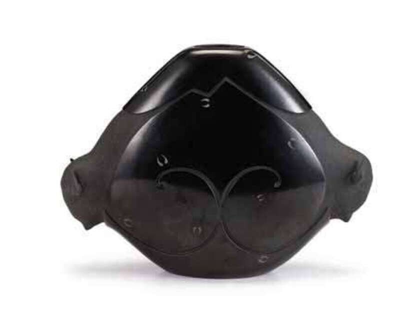 The flattened sides with black-on-black decoration, with twin lateral bull masks, signed.