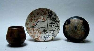 Together with an Alice Cling pottery vase (H: 3 1/2 in.), a Navajo wedding vessel, Many Goats (H: 7 in.) and an Andrew Pachuco decorated pottery plate, signed and dated 1991.
