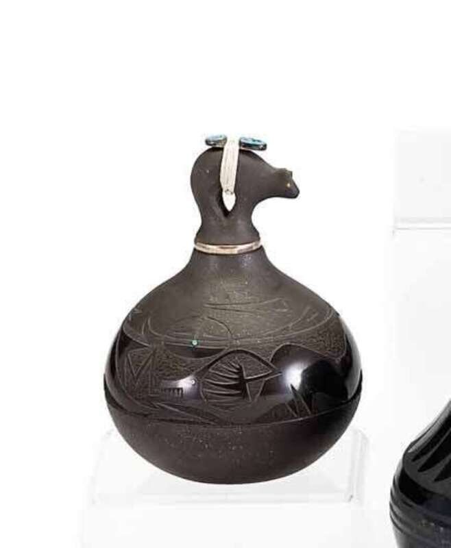Black slip, the sides centered by a stylized serpent band and inset beads, the lid with a silver ferrule in the form of a bear surmounted by turquoise, signed TP.