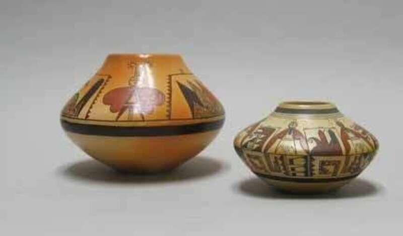 Together with a Karen Abeita (Hopi/Tewa Pueblo) pottery olla, the sides decorated in red brown and black with stylized designs, signed.