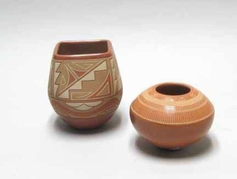 Redware, the square sides with carved white and tan geometric decoration, signed, H: 5 1/4 in; together with a Marie Gonzales (San Ildefonso Pueblo) pottery olla, redware, the sides with carved geometric decoration, signed and dated 1990.