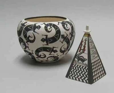 Together with a John F. Aragon (Acoma Pueblo) pottery olla, with an allover gila monster motif, signed and dated August 11, 1990.