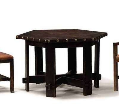 With a faceted covered leather top, the legs united by cross-stretchers.