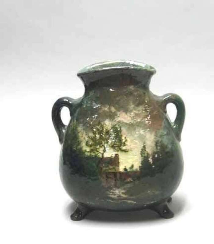 Early 20th century, of wide mounth footed flask form, centered by a landscape scene depicting a cottage in garden with figure seated on a wall, impressed marks.