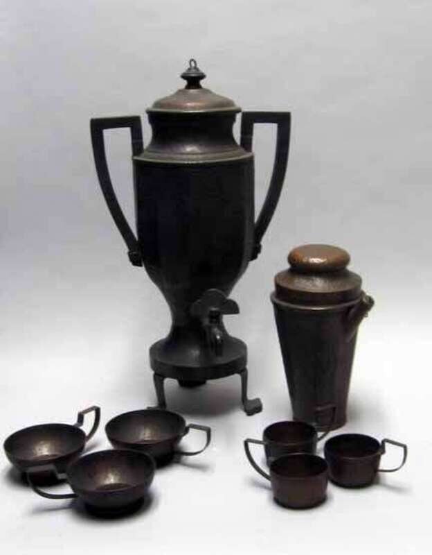 Early 20th century, comprising an electrified samovar and ten teacups, the cups stamped Jos Heinrichs, New York, Pure Copper, the samovar stamped Jos Heinrichs Paris New York Pure Copper Sterling Silver, together with a hammered copper and sterling silver cocktail shaker and ten egg cups.