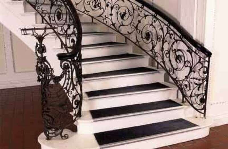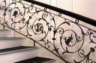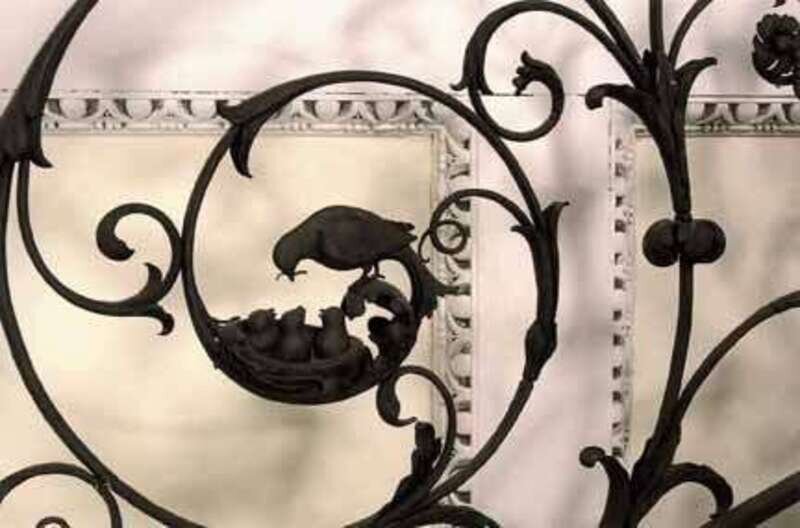 Circa 1919, from the Grand Staircase, the four curved 'stairway' sections and two straight 'landing' sections with scrolls throughout each centered by a different medallion featuring various flowers and animals, including a squirrel, dove, turkey, swan, rose, fruiting cornucopia, fish, songbird, hawk, heron, rabbit, deer, a bird feeding her young, birds in various stages of flight, a bird looming over a locust, a bird and other stylized fanciful birds of prey; the railings with a wooden banister, the inner 'stairway' railings terminating in ornate openwork planters.
