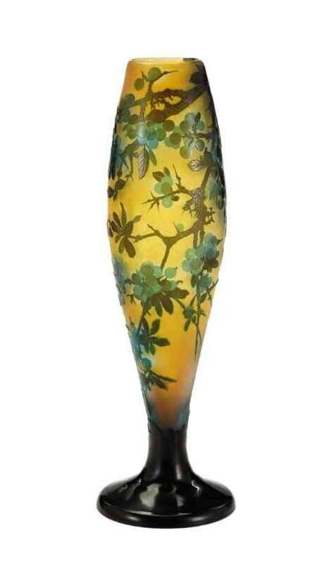 Circa 1900, the sides with cut green fruiting branches on a yellow ground, signed in cameo Galle.