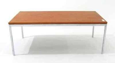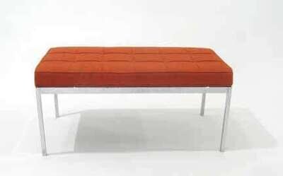 For Knoll, the coffee table with a teak top and chrome frame, manufacturer's label, the bench with orange upholstery and chrome frame, manufacturer's label.