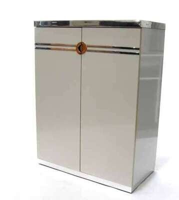 1970s, laminate and chrome, the doors opening to reveal six drawers, signed.