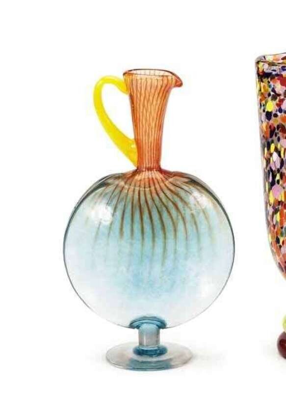 The flattened sides with mottled blue and orange, with an applied yellow handle, signed illegibly.