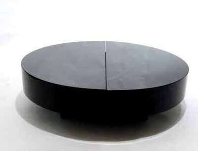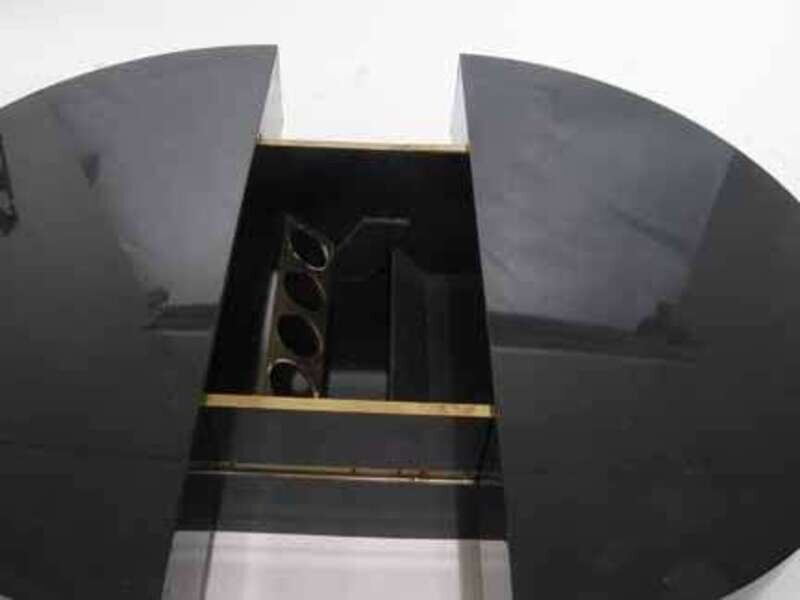 The circular lacquered top opening to reveal a fitted interior of wine bottle and glass holders.
