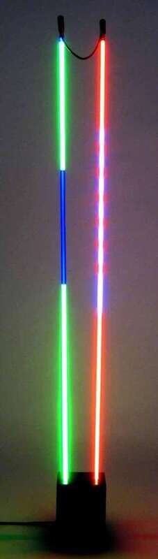 Neon sculpture, two standing tubes with varying red, blue, green and purple neon, the tubes signed and dated 1988 and 1990.