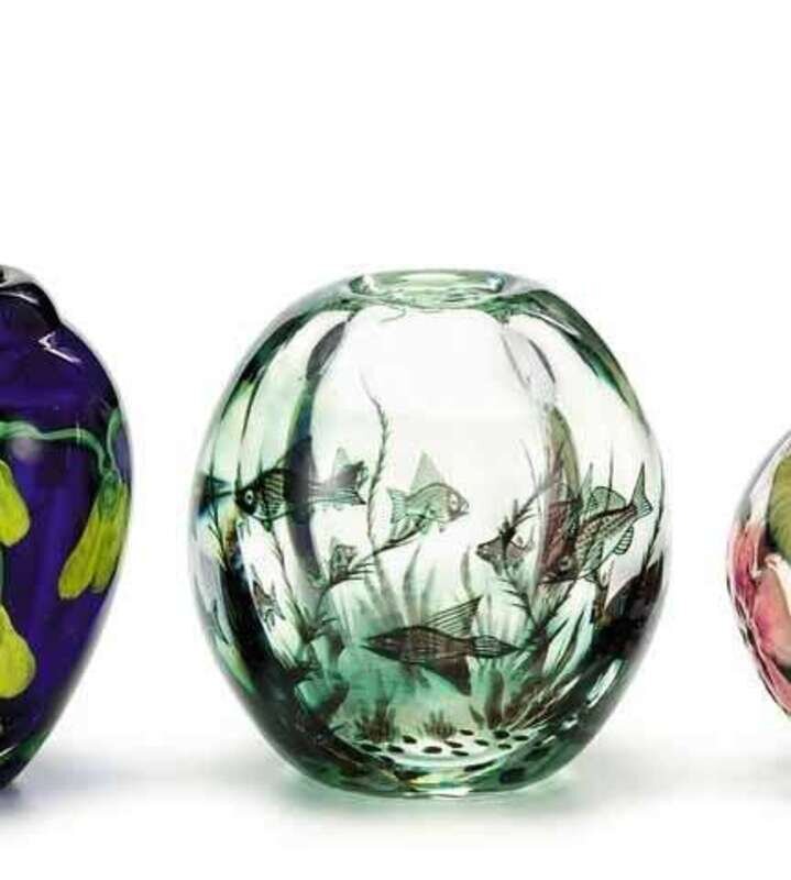 1950s by Edward Hald, with internal fish decoration, etched Orrefors Sweden, Graal 2317D, Edward Hald to underside.