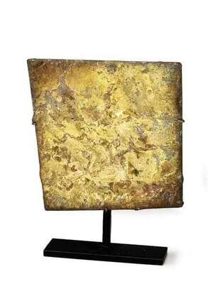Circa 1955, brass melt coating over steel, of shaped square form, with a sculpted 'landscaped' surface; accompanied by a letter of authentication, raised on a later fitted steel stand.