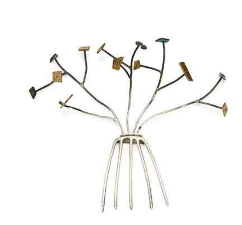 Five flowering branches with thirteen quadrilateral, oval, pentagonal and four-leaf clover brass "flowers" flowing out of five-prong comb-like base.