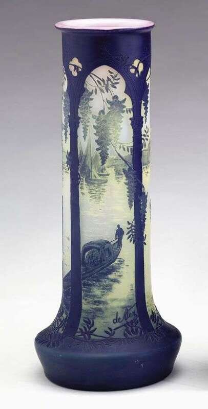 Circa 1905, Of tall cylindrical form, the sides cut with a continuous Venetian scene viewed through pierced gothic arches with trailing wisteria, signed in cameo Devez.