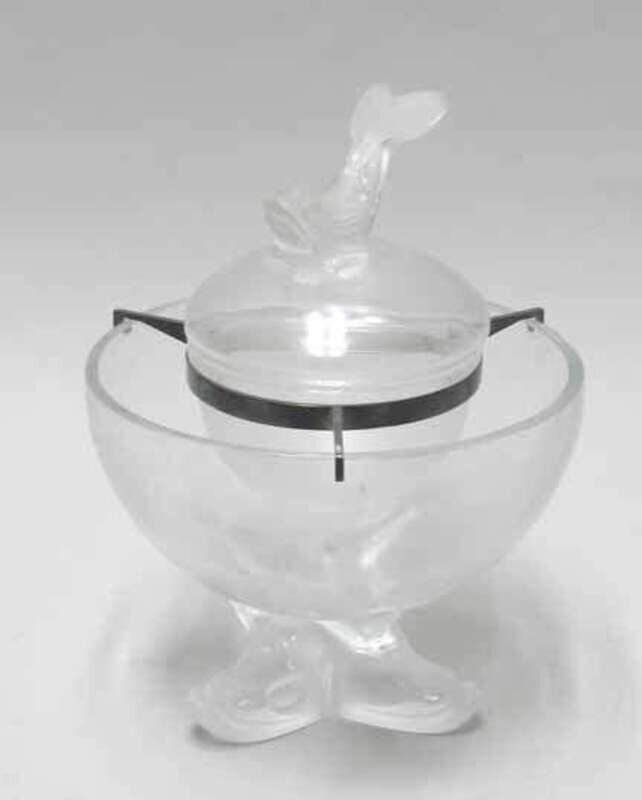 The caviar bowl with lid surmounted by a dolphin finial resting in a cooling dish raised on a tri-form dolphin form base, etched Lalique France.
