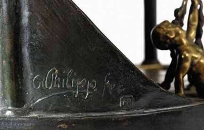 Early 20th century, the bronze depicting Victory raising laurel wreaths to her court, signed Philipp with Aust-Reich AR foundry mark and stamped Made in Austria, the shade with pink, green and brown glass signed in cameo Galle, electrified.
