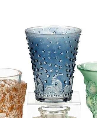 Marcilhac no. 10-914, model introduced 1938, molded glass with blue patina, stamped R. Lalique France