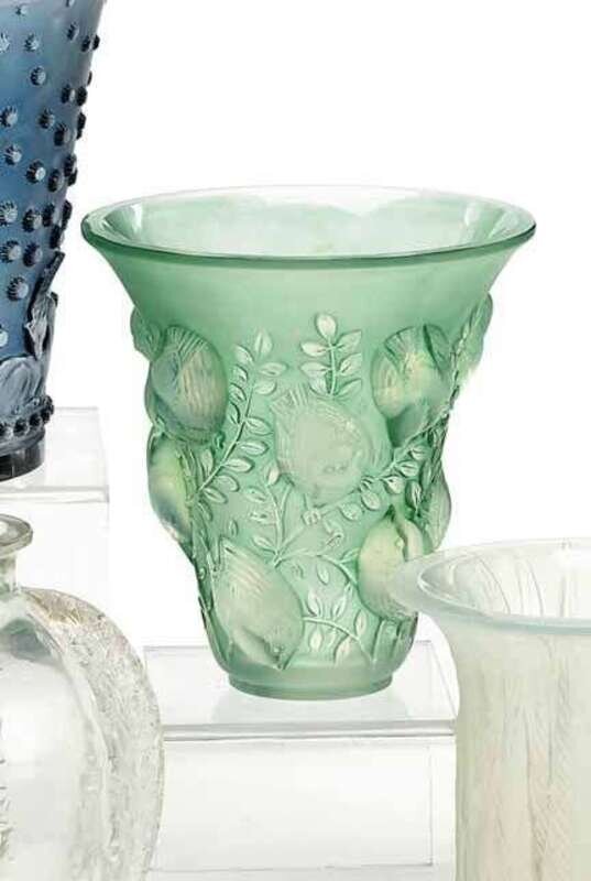 Marcilhac no. 1055, model introduced 1930, molded opalescent glass with green patina, stamped R. Lalique, France.