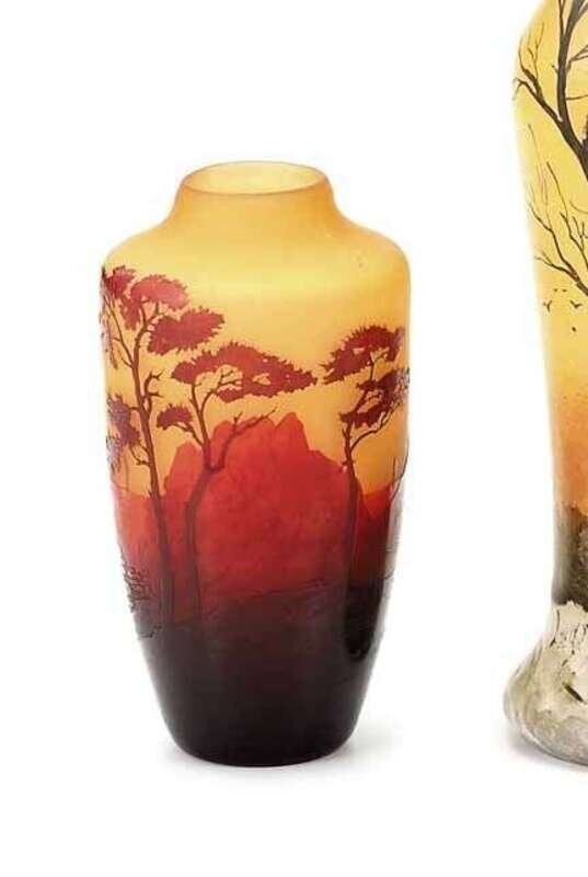 Early 20th century, yellow glass with dark red overlay, cut in a coastal landscape, signed D'Argental.
