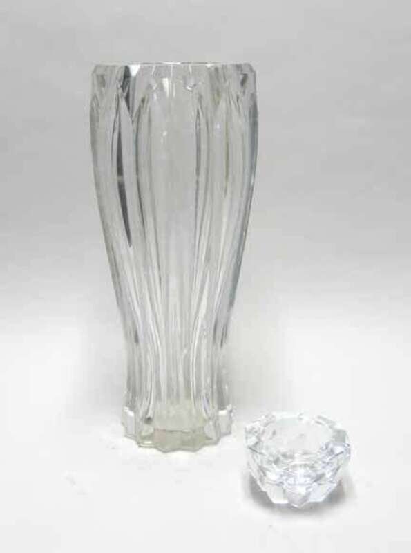 The large cut crystal vase with faceted sides together with an ashtray, both with factory stamps.