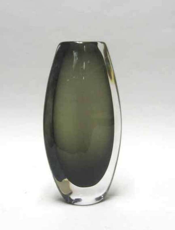 Smoky glass cased in clear glass, etched Orrefors and numbered.