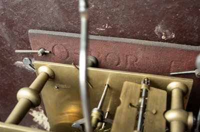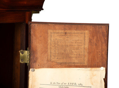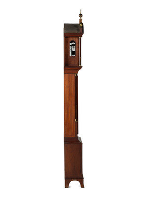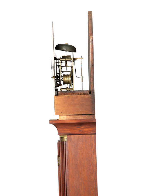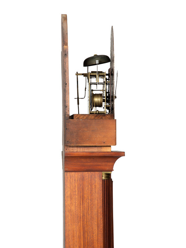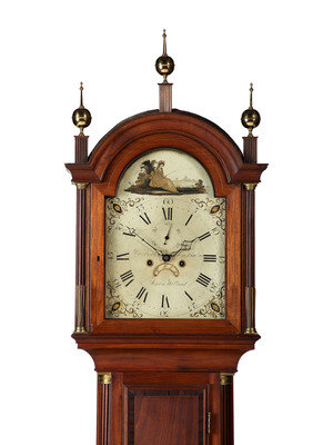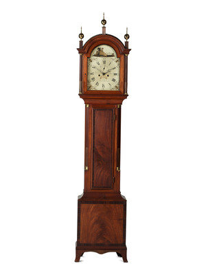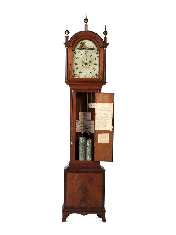 A Federal Carved and Inlaid, Brass-Mounted Mahogany Tall Case Clock