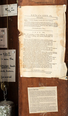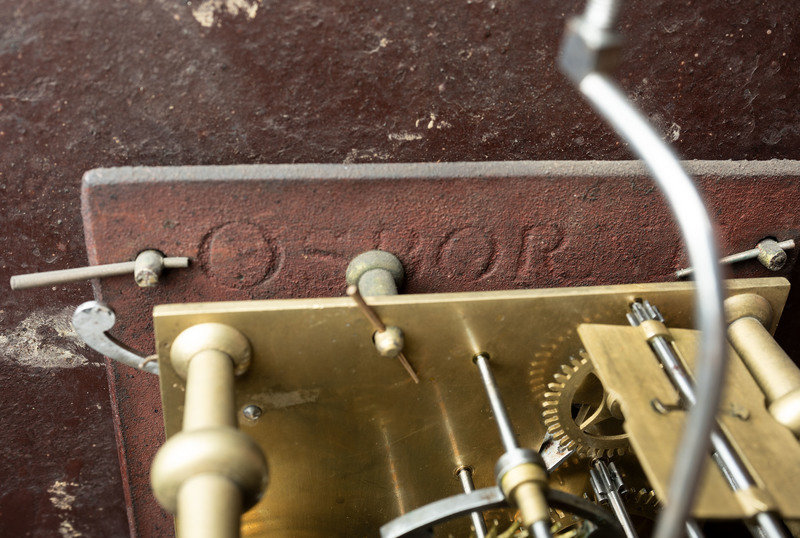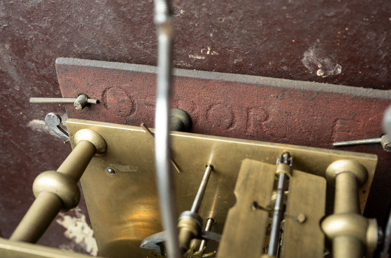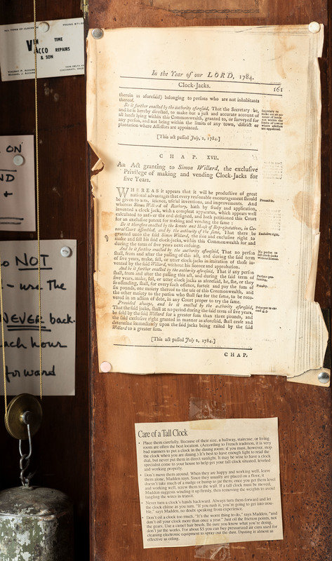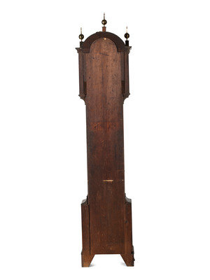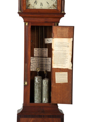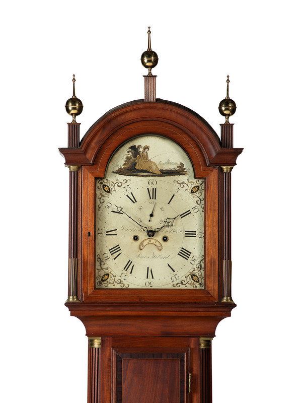 retains three brass ball-and-steeple finials, the painted sheet-iron dial depicting a gilt lady fishing in the moon-phase aperture, gilt scrolled spandrels, the dial inscribed Warranted for Sam Badlum / Simon Willard, the mounting frame impressed OSBORNE, the works, pendulum and weights appear to be original to the case.