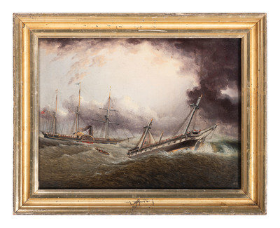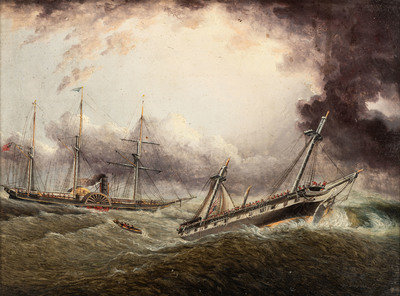 Possibly a prototype for the Currier and Ives engraving The Steam Ship Washington Capt Fitch, rescuing the passengers of the Ship Winchester of Boston, (Tuesday May 2nd 1854), first published in 1854.
