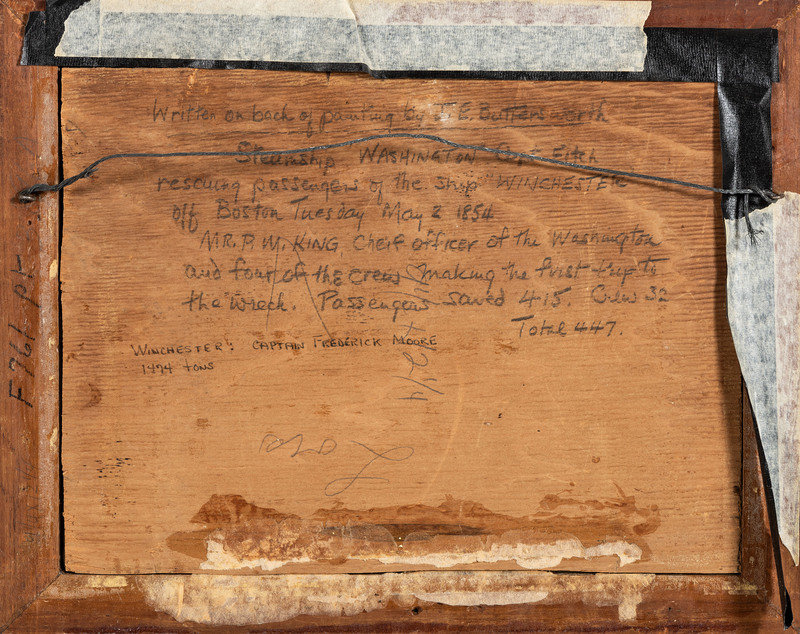 inscribed Steamship 'Washington,' Capt. Fitch rescuing passengers of the ship 'Winchester' off Boston Tuesday, May 2, 1854. Mr. P. M. King, Chief Officer of the Washington, and 4 of the crew making the first trip to the wreck. Passengers saved 415. Crew 32. Total 447, verso