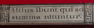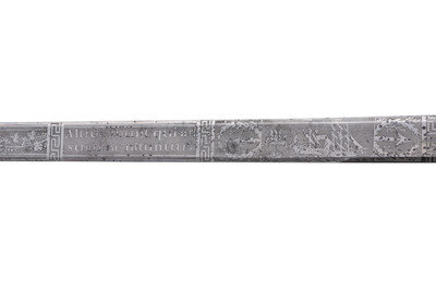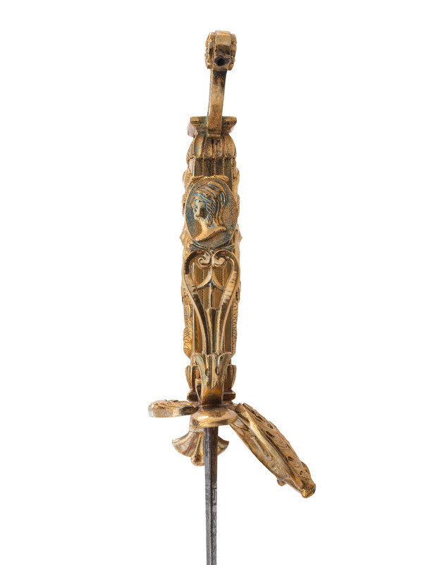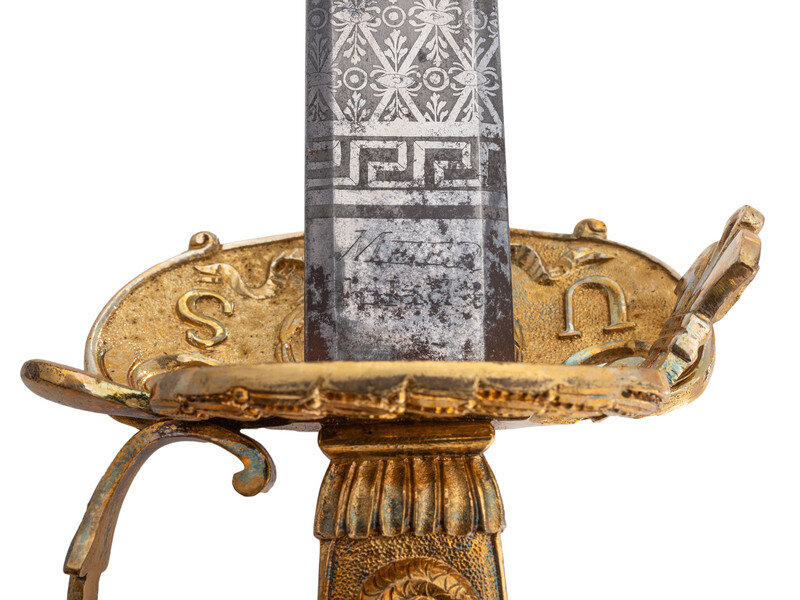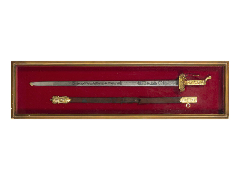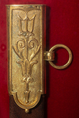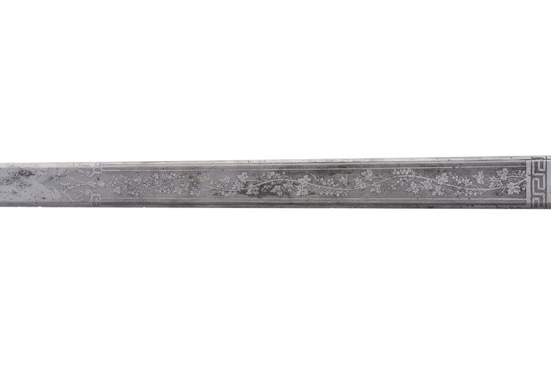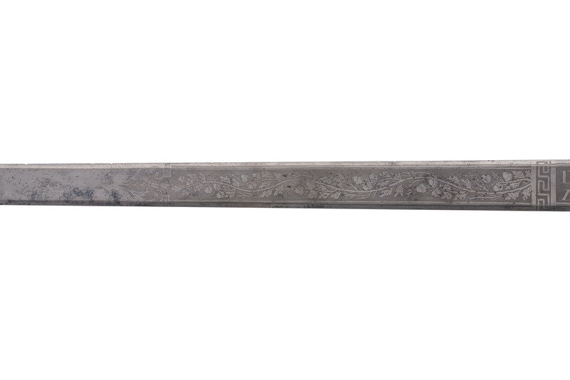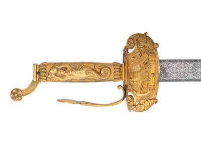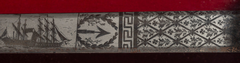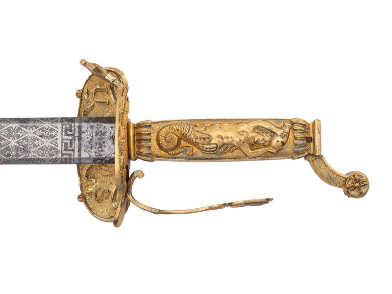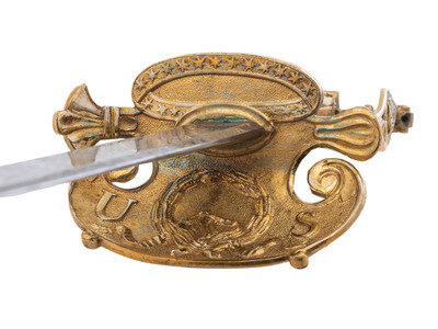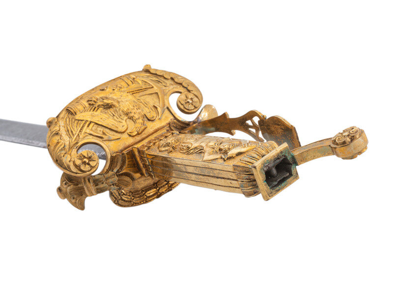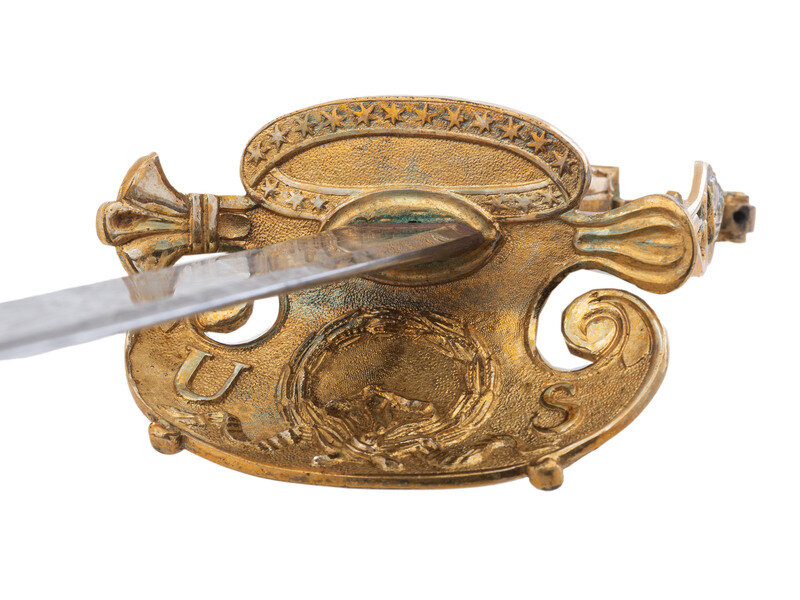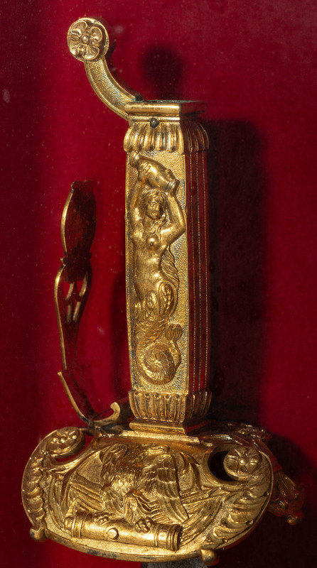 32.25" unfullered double-edged spear point blade. 38" in overall length overall. 5.75" gilt cast brass hilt with deep relief chased patterns. Grip ribbed on top and bottom with detailed raised mermaid motif on either side. Hilt and knuckle bow chased with nautical, patriotic, and classical themes. The down-turned exterior of the clamshell counterguard shows a Spread-Winged American Eagle surmounting anchors and a cannon and surrounded by a wreath. The interior of guard is decorated with a raised laurel wreath flanked by U and S. The diminutive oval reverse guard opposite the counterguard is chased with simple foliate boarder motifs while the interior shows an oval of 18 stars, arranged as a line of 13 on top with two groups of three underneath. Bottom half of knuckle bow is broken and missing as is the Roman soldier pommel cap. The blade is acid etched for 23" of its length with four rectangular panels on both sides showing various designs separated by Grecian meander frets. The reverse blade is etched with fine floral grape vines, text reading Altius ibunt qui ad/summa nituntur (He who aims highest, rises highest), a naval battle scene, panoplies of arms and geometric floral work. The obverse of the blade shows oak leaf scrolls, followed by the text DANIEL RICARD SAILING MASTER/Lake Champlain 11 September 1814, a panoply of arms with trident and more geometric floral work. The ricassos are marked MEER/Philadel on the obverse and W. ROSE on the reverse. Included is a partial leather scabbard with gilt fittings showing nautical motifs and a single hanger. The center mount is missing from the scabbard. Item comes with a 44.5" x 11.75" case frame, and has been removed from case for inspection.