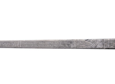 The War of 1812 was the only time that Congress ever presented swords to junior and warrant officers of the US Navy in appreciation for their service in specific actions. Congress authorized swords for presentation to sailing masters and midshipmen for a total of four actions during the war, The Battle of Lake Erie (September 10, 1813), The Battle of Lake Champlain (September 11, 1814), the action of the sloop USS Peacock against the brig HMS Epervier (April 29, 1814) and the action of the sloop USS Wasp against the HMS Reindeer (June 28, 1814). Some 80 or so swords were authorized by Congress for presentation to the sailing masters and midshipmen of those battles. Most of the swords featured gilt brass hilts and guards, but the swords from the Wasp-Reindeer action were of gilt silver. The blades were produced by William Rose and etched by John Meer of Philadelphia. They cost the somewhat astronomical sum of $250 at the time (circa 1817), which would exceed $200,000 today. A total of thirty-three swords are listed in Peter Tuite's US Naval Officers - Their Swords and Dirks as having been presented for the action on Lake Champlain. Of those, eleven went to sailing masters and twenty-two went to midshipmen. Of those swords, Tuite notes that nine were extant at the time of writing (2004), four of the sailing master swords and five of the midshipman swords. Of the extant swords, that of Sailing Master William Robins has a misspelled name on the blade, where it is etched as "Robbins". It is worth noting that Sailing Master Daniel Ricard is not listed as one of the recipients of these swords and an extensive search of period newspapers and military records do not reveal his name. It is quite possible that the name was horribly botched when it was etched, a not so uncommon event at time when spelling was often phonetic at best. Despite the need for significant restoration, this is a legitimate and apparently previously unknown example of a rare and desirable Congressional Presentation Sword from the War of 1812.